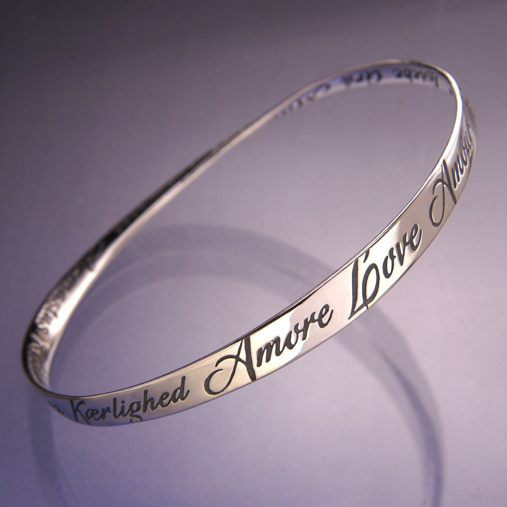 An homage to love: there are over six thousand known languages throughout the world. One can be sure that each contains at least one word for love, a universal emotion that unites us all, regardless of where we live or what language we speak. This bracelet is engraved with the word love in twenty eight languages.