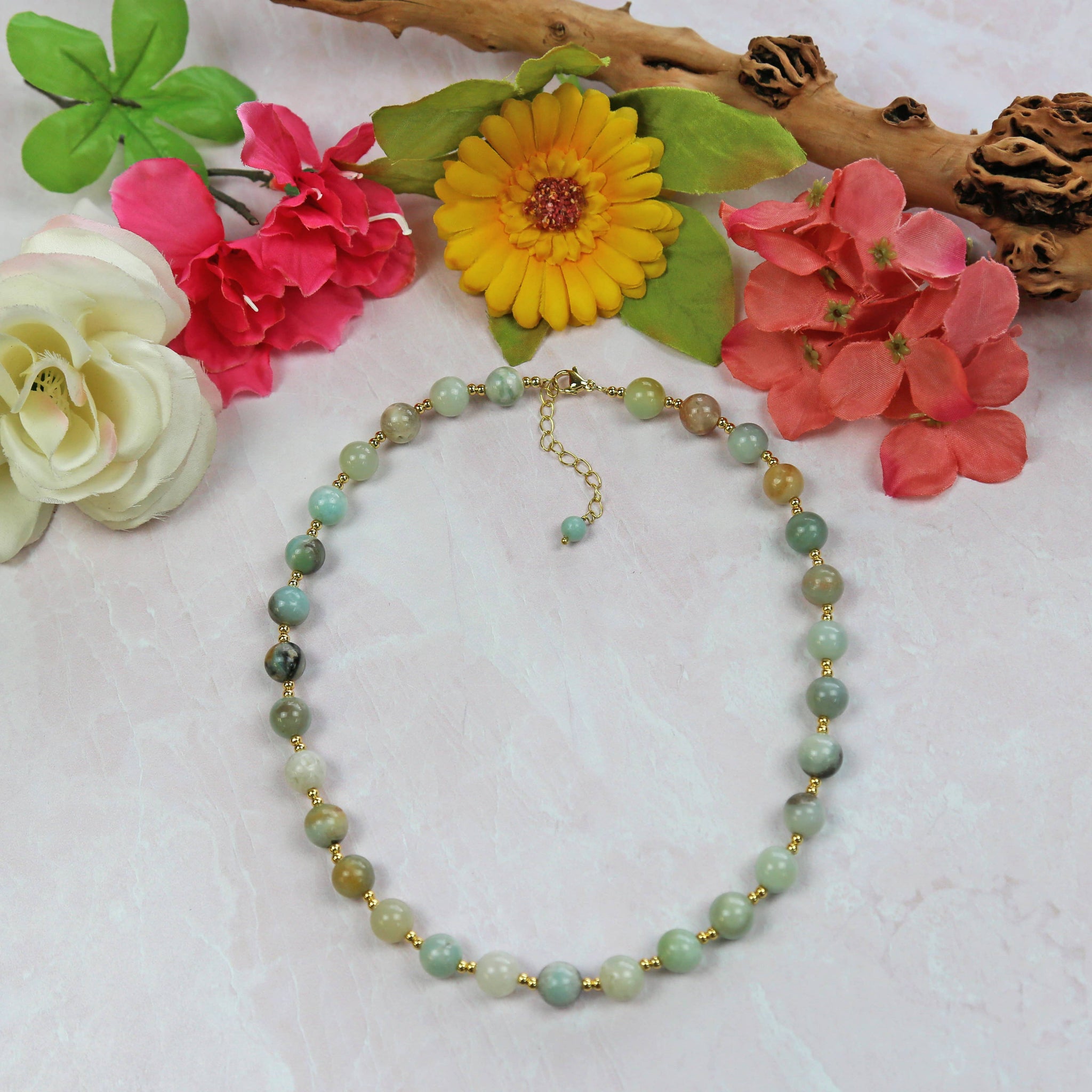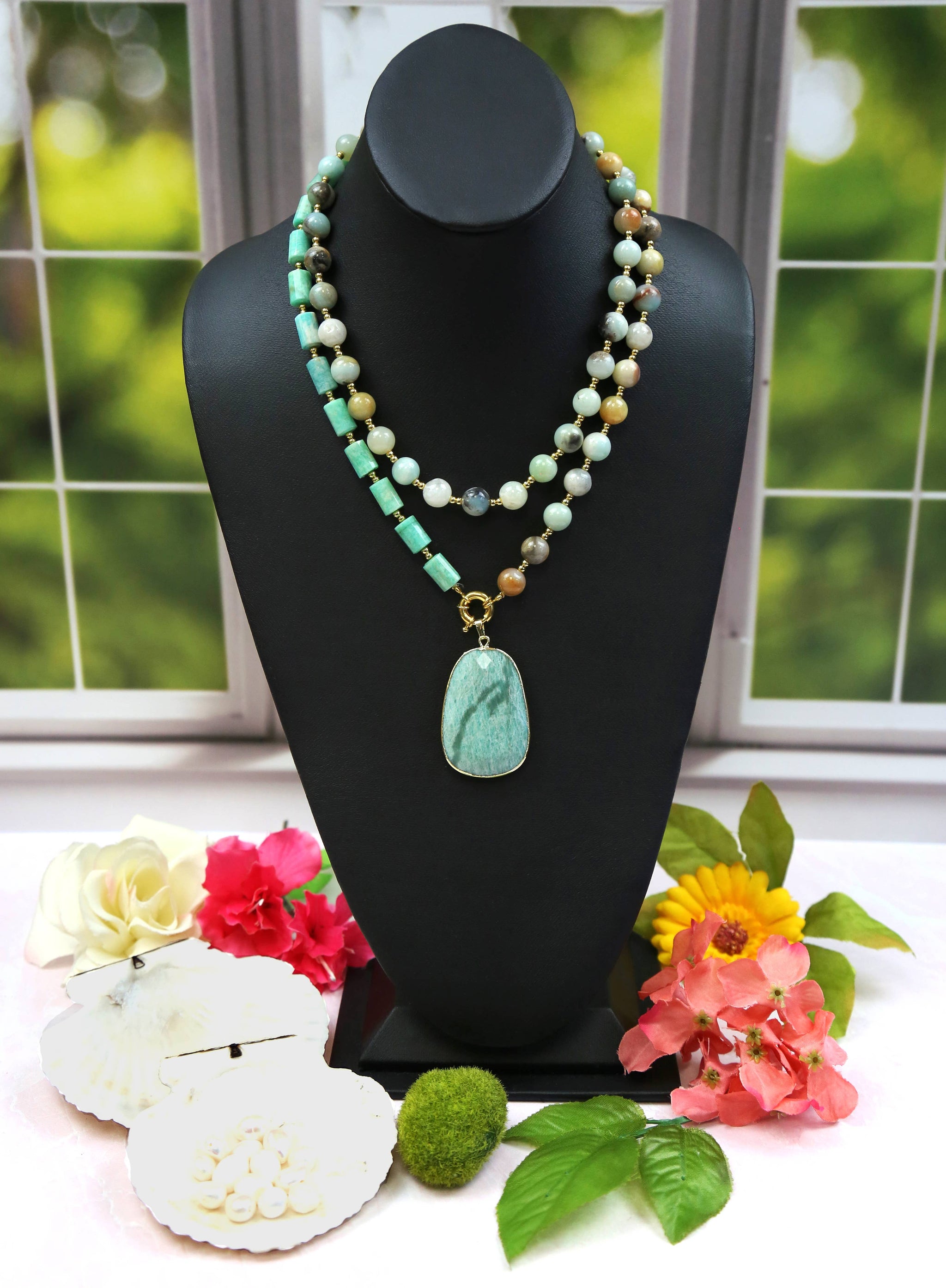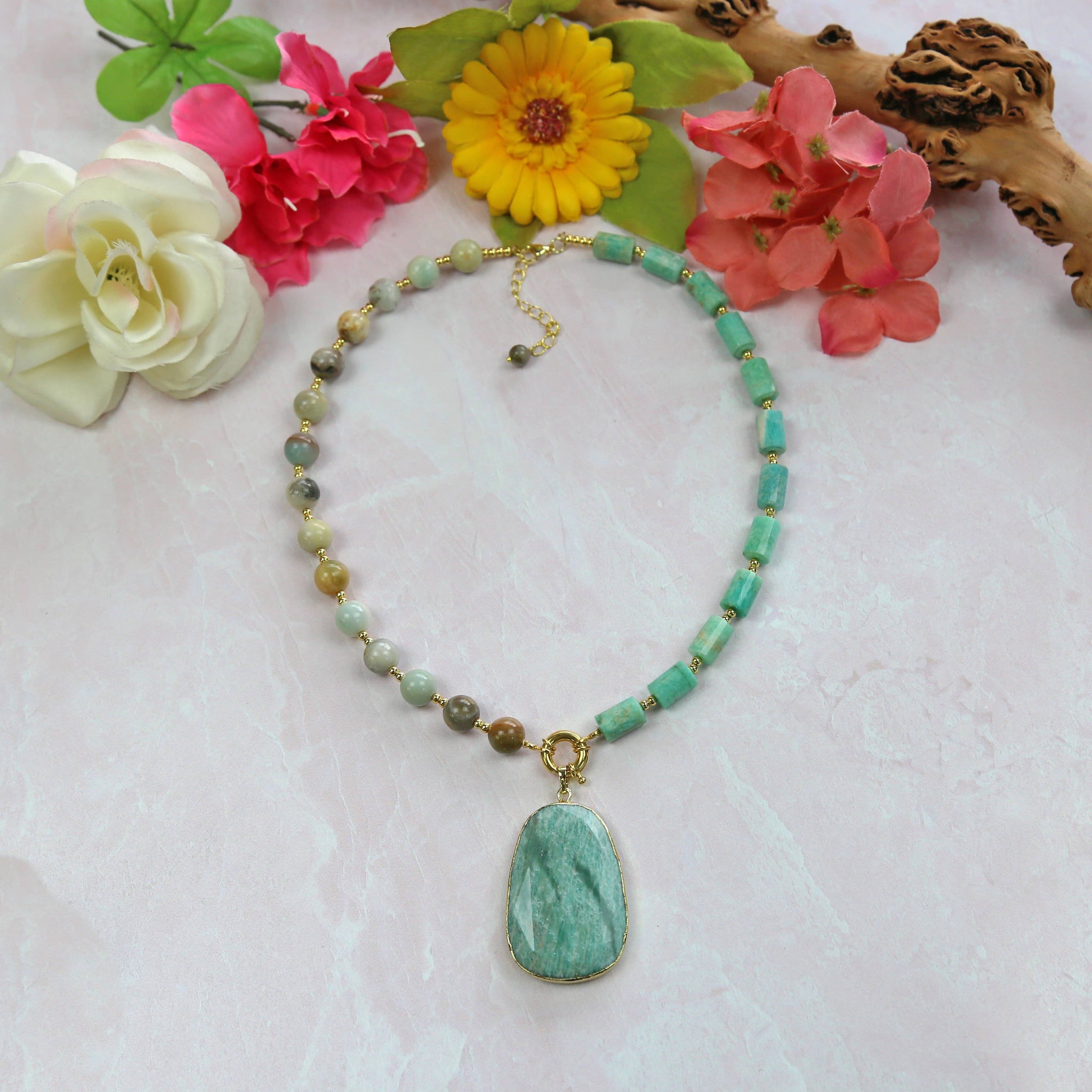 Material: 10mm Round-shaped genuine Amazonite, 12mm barrel-shaped Russian Amazonite, gold-tone spacer beads, and oval-shape Russian Amazonite Pendant,