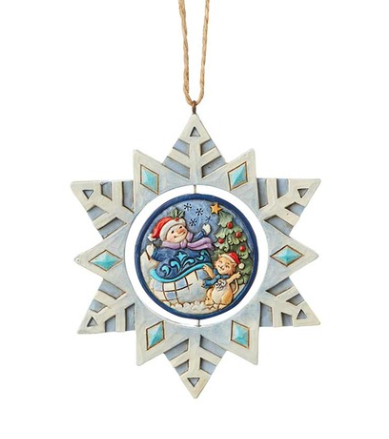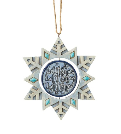 Let it Snow, Let it Snow! In the center of this snowflake shaped ornament is a scene of a festive snowman outside next to a holiday tree. Gently turn the center disk to share a wintry message celebrating the season.