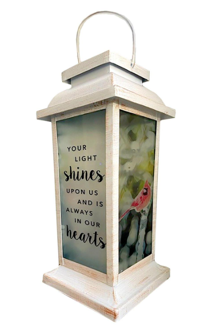 This solar powered metal lantern, is an addition to your backyard and an enduring sentiment to loved ones lost. Cardinals, believed to be the messengers of heaven, appear when angels are near. Light the way home for your cardinal friends. Bereavement.