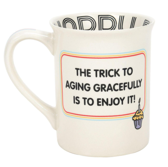 Celebrate another birthday in style with this festive mug by Our Name is Mud. With splashes of color this mug shares advice to live by: the trick to aging gracefully is to enjoy it! Be sure to take time to relish your birthday and every new day!