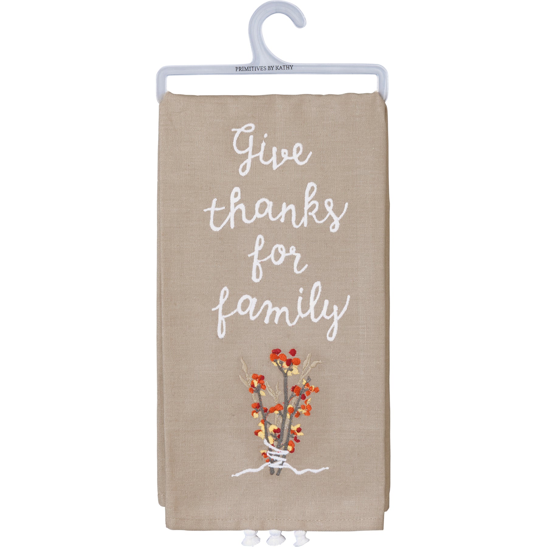 A fresh update for fall, this linen blend dish towel features an embroidered "Give Thanks For Family" sentiment and floral design in a fall-inspired palette. Complements well with coordinating styles for a cohesive collection. Machine-washable.