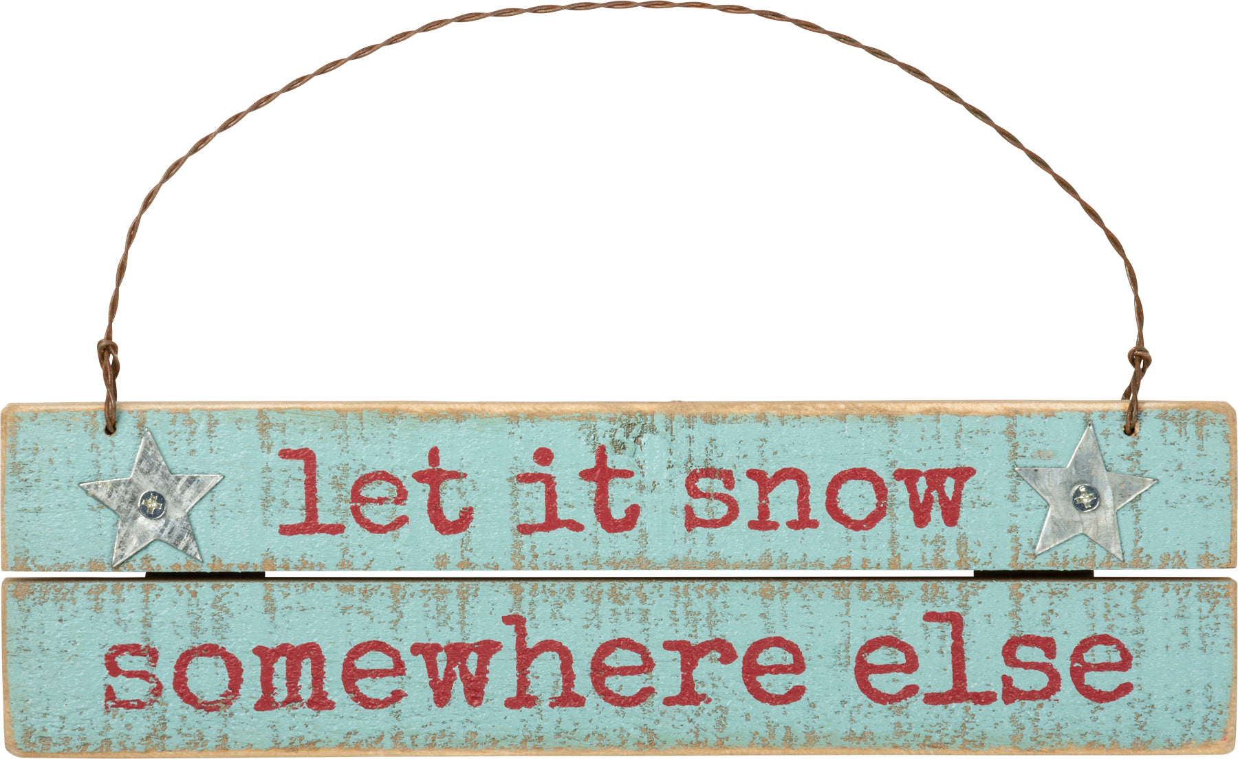 A wooden ornament that's perfect for a Christmas spent at the beach featuring a distressed "Let It Snow - Somewhere Else" sentiment with metal star additions in a festive but beach-inspired palette. Complements well with coordinating styles for a cohesive collection. Contains twisted top wire loop for easy hanging.