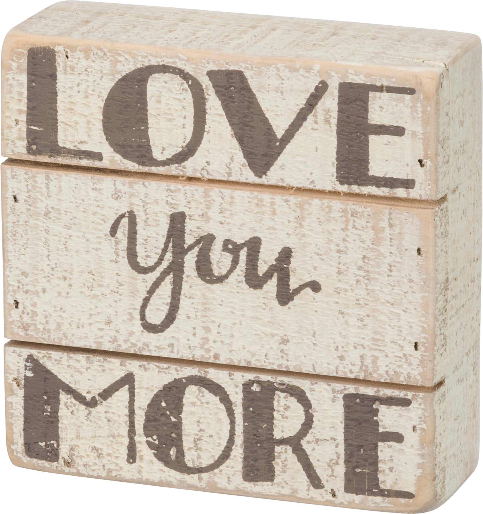 A slat wood box sign featuring a distressed "Love You More" hand lettered sentiment in a neutral palette. Complements well with existing decor or coordinating design pieces. Easy to hang or can free-stand alone.