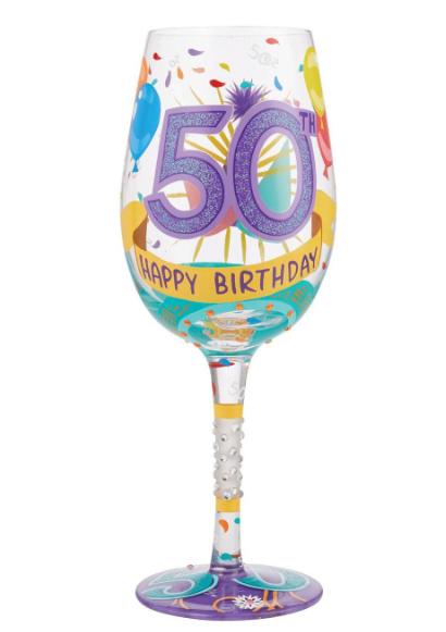 Celebrate turning 50 with a spectacle of color and class. Covered in balloons, this 15 oz capacity wine glass sparkles with birthday charisma any day of the year. Capture the milestone with this stylish sipper from Designs by Lolita, cheers to you!