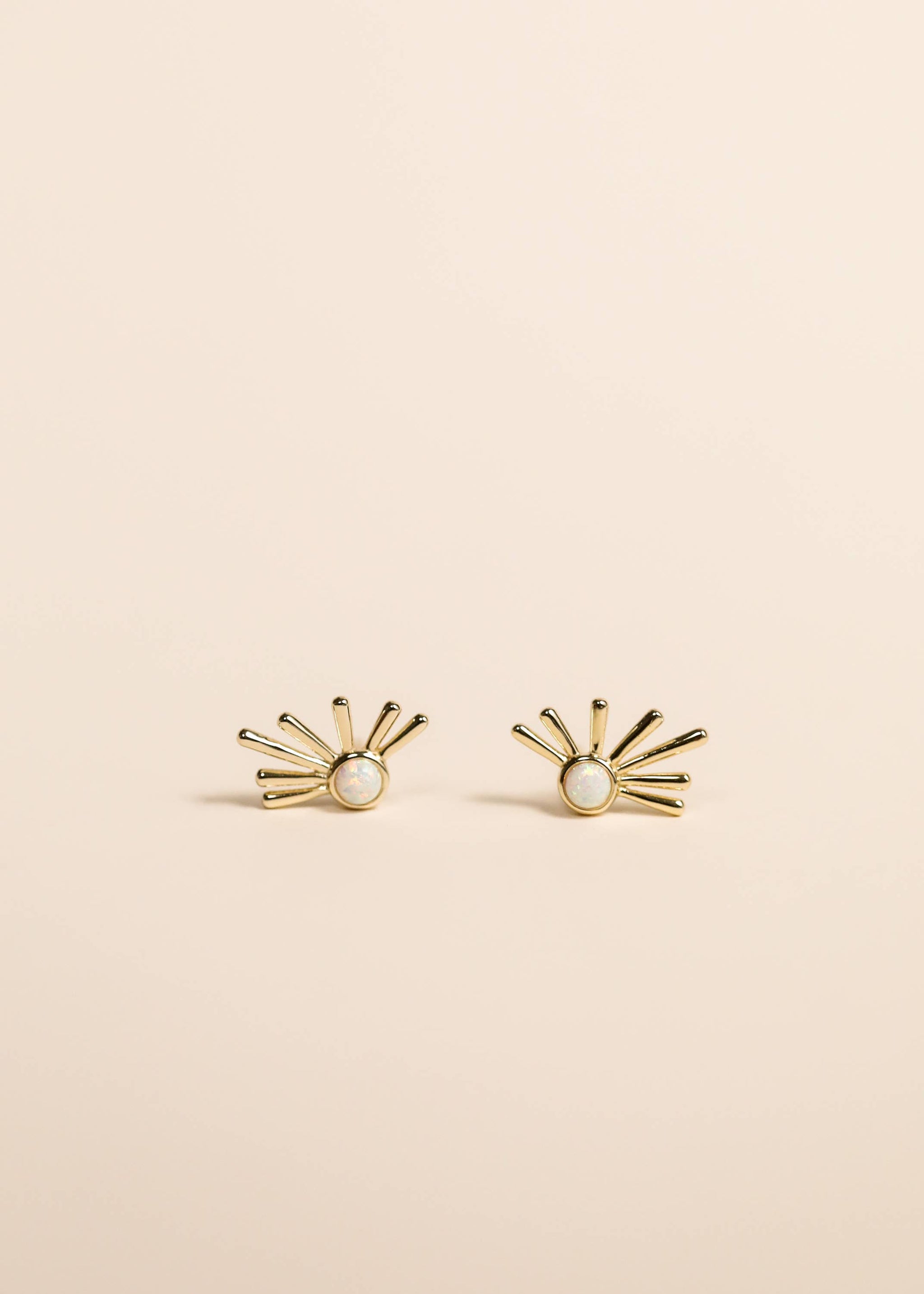 A white opal stud set inside an organically shaped sun ray.