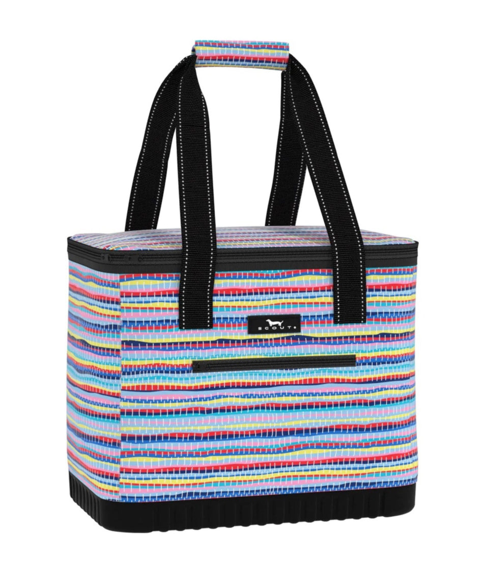 This large, soft side cooler holds a 24 pack with ice so you can literally bring the party with you!! Crafted from Scout's durable poly twill and featuring a reinforced bottom, you can't beat The Stiff One for sturdiness.  It also features a zipper closure and two exterior pockets for a bottle opener or other essentials. Wipes clean.